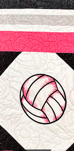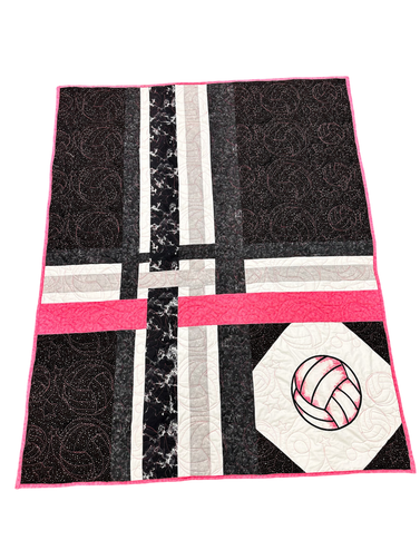 This Volley for the cure Charity quilt we did is turning into a kit this cute 50x63” quilt top has a embroidered Volleyball in the corner that we are sending it’s over 10” and has the pinks and black to complete this-
