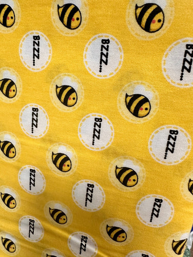 this yellow bzzzzz…. background with the cute honey bees that are the size of nickels, every which way the honey bees are repeating every couple inches with bzzzz all over this is a smaller print