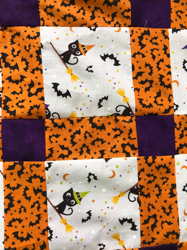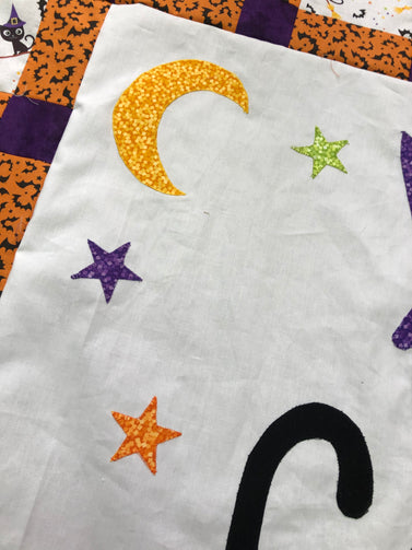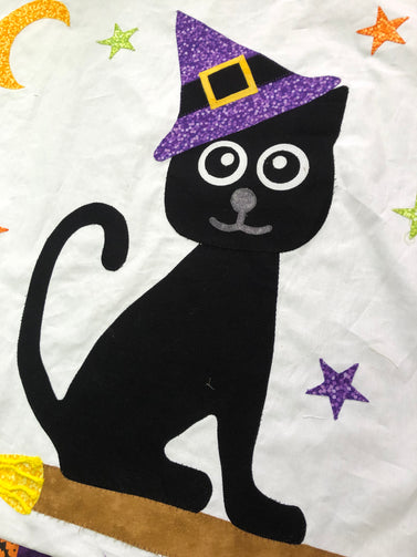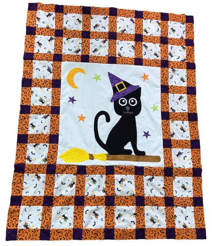finishes 42.75”x56” finished comes with everything you see and binding ! Your hat choices are orange geeen or purple please send a message with your order noting which one you would like all the appliqués are pre backed and all is cut all you need to do is start sewing!