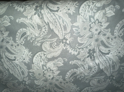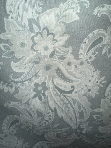 Camelots cute Winter paisley collections this soft stone gray has 5 different hues of the same gray- want to put it with green it pulls green tone want to use with blue it pulls a country shade of blue so this is very versatile and forgiving larger print every 5” with a about 6” patterned paisley design