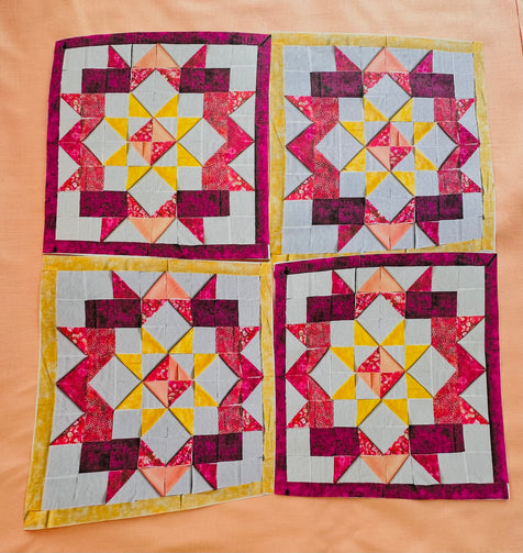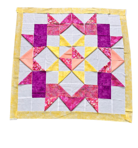 this wallhanging very beginner friendly with 5” squares and some will end up half square triangles! with a 4” finished border you will bind on that so not to cut into your pretty quilt blocks!