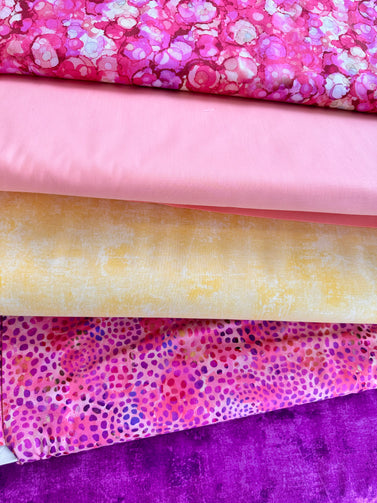 This cute bright and cheery quilt ended up coming out as a 87” square this Cute charm pack friendly is all precut quilt blocks it includes everything thing you need for the top and binding , since it’s a queen size we don’t include the backing a lot of quilters want to purchase after their done we do have the pink chai forties and we will discount since you purchased the quilt kit from us just message us .