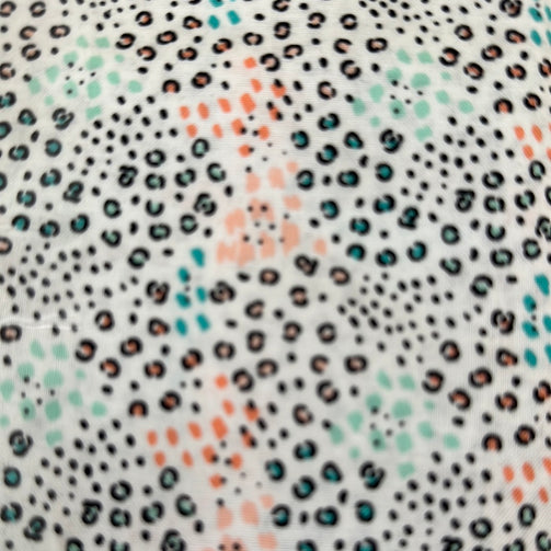This Smaller print 1/8th to 1/4” prints packed full with The 1/8th of a inch in between next design in fabric- white background turquoise ,mint green ,black ,coral and peach this fun print comes in a 2 yard cut if you only want 1 yard just message us we will cut it!