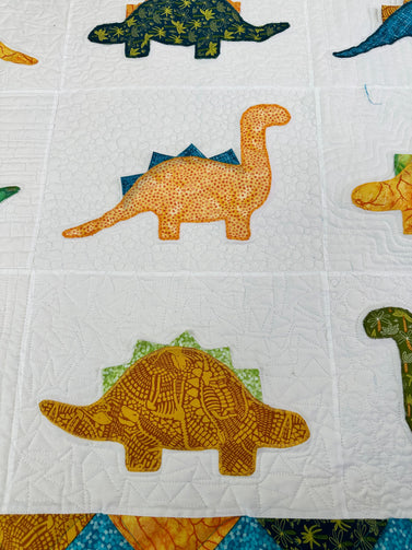 kits vary but what is pictured is what your getting might be not in all exact Dino/ prairie points but everything is pictured and we label the bottom of each piece of fabric what it is for! This cute quilt has all premium fabric moda dino stomp stomp and roar fabric collection and Northcott fabrics also this is a very easy quilt to do. You will need heat and bond or wonder under whatever you prefer to do the applique in. Pattern has different sizes but we have the 44”x53” crib size. We are working on a girl one also! Coming soon or message us about it! This ships free and we will quilt it for 1/2 price. At $20.00 pictured is our finished one but you get idea on the fabrics !