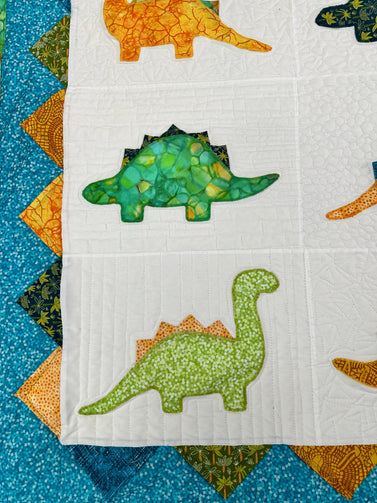 This cute kit comes with the Dino roar pattern and all the fabric to do this kit you will need batting and backing we provide you with the fabrics for dinosaurs prairie peaks and basically the whole top with binding!