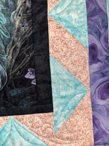 my quilt finished at 28”x33” all is pre cut and instructions picture and hot fix crystals are there also you can quilt this or can ship back to us and we will quilt for 1/2 price quilting ! Beginner level! Pre cute strips all cut this is mindless sewing!