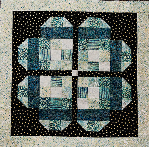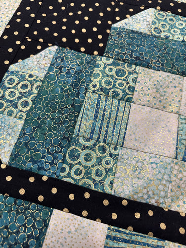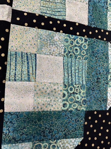 This cute wallhanging comes complete with pattern instructions the top and binding all you need is back and batting. The fabrics are from Northcott and Camelot fabrics all premium fabrics comes in with unique color lagoon green shimmer collection and black with metallic gold pok a dots for background. This picture doesn’t do this justice