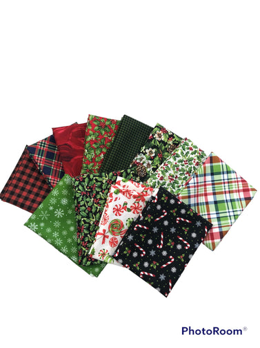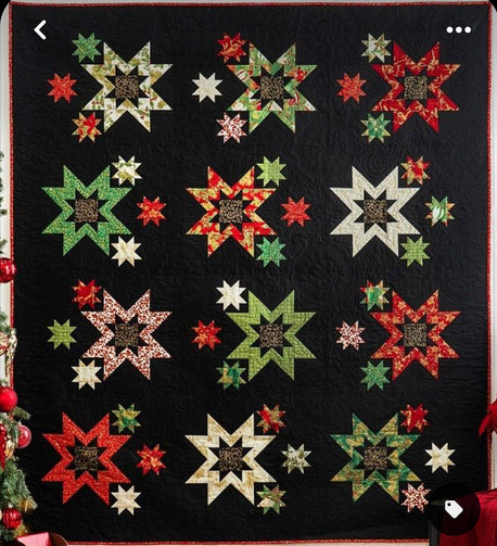 Merry and Bright quilt kit your getting all the fabric it takes to make this the picture is only an example your getting 12 fat quarters your binding as pictured and binding the background black fabric. All Northcott fabrics 8+ yards for this kit! You will get your pattern and the fabric pictured or something similar if we have sold out of one of them, everything for a finished top and binding and pattern 63.25”x71.25” finished Suggested 4 yards for backing message if need anything |