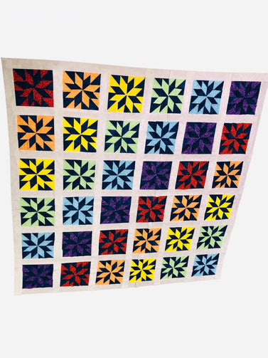 This colorful kit is a sit down and sew away all is pre cut for you to sit and sew! This kit contains all your block pieces dye cut - all your sashing and surprise binding! Everything to make your quilt top pattern instructions reference picture and binding all you need is backing which we sell if your interested send a message.