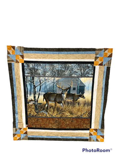 This rich colored pre cut kit finishes as a throw/lap size at 64”x51” it’s great for that special Guy or any nature lover. With barn and deer and the pheasant you can’t go wrong with this quilt kit-