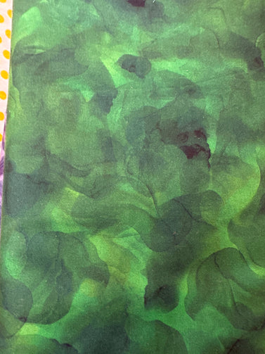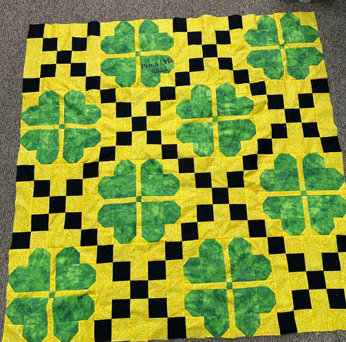 60” finished beginner friendly this fabric is pictured that your getting this was a customers and she wanted embrodiery if you are wanted this then comment to us or leave a phone number if we quilt this for you at our 1/2 price your at 27.50 if you want it embroidered add 10.00 we will embroider once it’s in here before we quilt it! Camelot yellow and the green evergreen Aura QT fabrics with black dots for your squares and black binding so Sharpen this quilt premium fabrics pattern top and binding you will need backing and batting!