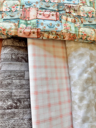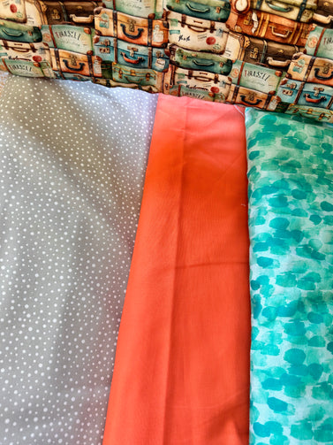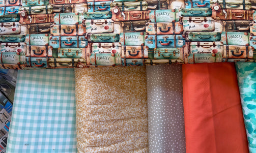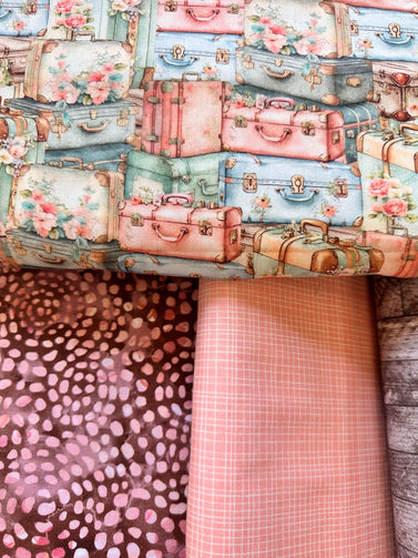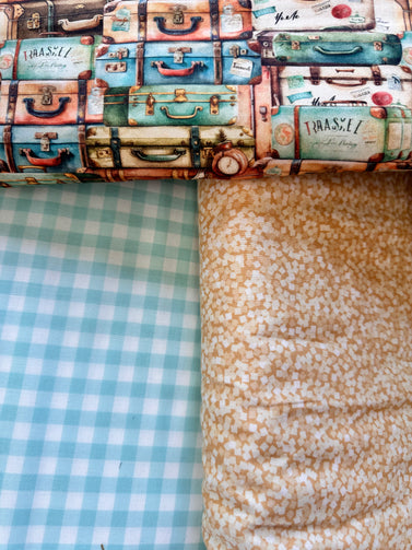 Pack your bags and get ready to take off this cute throw size kit comes with your Slice of Pi Suitcases pattern and Artiq textiles eco cotton traveling luggage fabrics and to compliment them the Northcott fabrics and finish with Camelot fabrics all premium fabric-