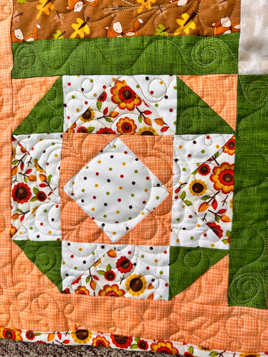 This pre cut quilt kit is sew cute with Foxy Loxy front and center this cute Minky fox matches this fall theme - it features leaves and fox applied applique and then the pieced blocks in the corner and super cute fox fabric. Backing is woven yarn fabric so soft in a beige thin line checked and orange Minky - dry on low setting and Artiq Textiles fabrics eco cotton excellent kit Pelion 80:20 batting floral binding enjoy fox flowers leafs and polka dots and pre cut to boot. Sit and sew project in a day