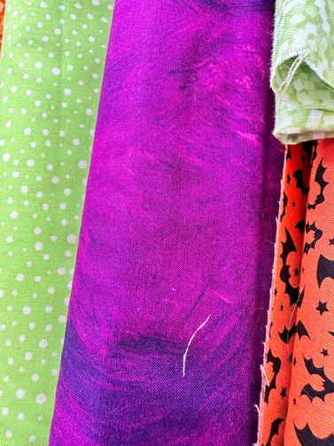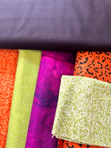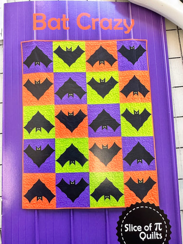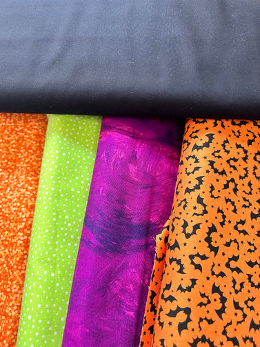 Bat crazy has no pieced curves , but uses a fun technique that results in the illusion of curves! Halloween prints blenders and solids work as well this intermediate level kit will be a wall hanging just in time for the festive holidays! Christmas in July treat yourself but to a holiday before Christmas we are doing glam backgrounds and black bats green eyes and the backing and binding this is a complete kit for a 36”