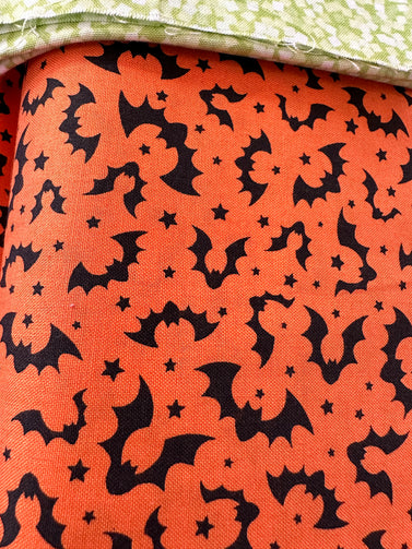 Northcott fabrics glam eyes plaster Paris petunia squares Camelot green Dottie’s squares and Patrick lose bat fabric backing and black Camelot bats and binding